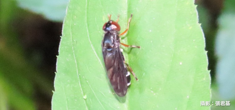 ↑↑黑翅蚜蠅 Paramicrodon nigripennis / 攝影:張君基 (蚜蠅科/巢穴蚜蠅亞科/副微蚜蠅屬) 型態描述:體色黑色,腹部有白色橫紋;複眼呈現暗紅色;平衡棒呈現白色;各腳橘色,跗節褐色;翅膀顏色較深,看不太清楚腹部紋路;停棲時姿態略為躬身。本種分佈於低海拔山區,外觀特徵如圖所示。 本屬1種 2025/10/04發現於桃園大溪,少見。 攝影:張君基 / 鑑定:Bill Wu / 網頁建置:Z-Ln、Zhang Yongjie