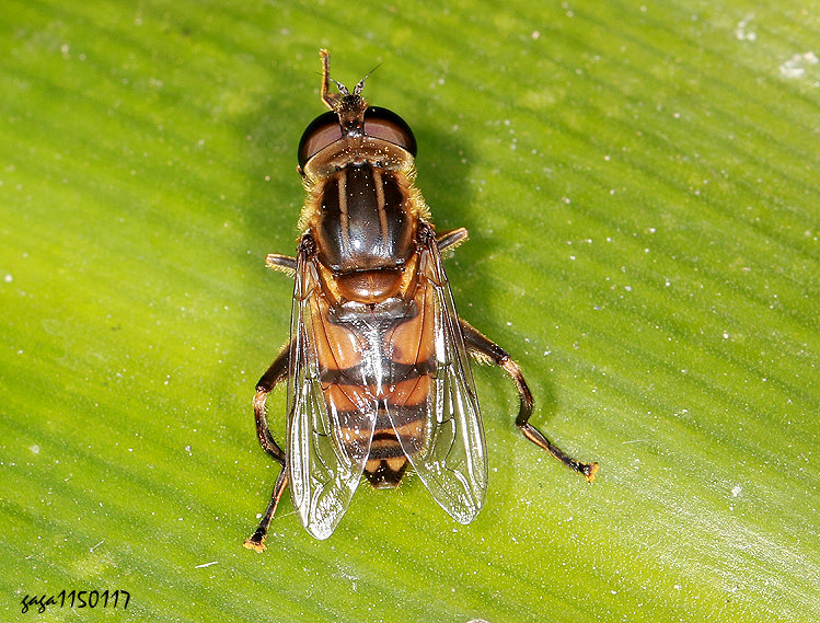↑孟加蚜蠅 (食蚜蠅科 / 管蚜蠅亞科 / 梅生蚜蠅屬) 體長約9-10mm,體型寬廣,複眼褐色至黑褐色,胸背板黃褐色,中央有3條粗獷的黑色縱帶,縱帶達後緣,小楯片黃褐色,腹部黃褐色有4條黑色橫帶,第1-2條上下有縱斑相連,第2-3條細窄,波狀,翅膀透明,各腳黑色,腿節粗壯,關節具黃斑。 本屬4種,本種又稱斑腹粉顏蚜蠅,廣泛分布於印度、孟加拉、越南、馬來西亞、澳洲、中國南部和台灣。本種紀錄於低海拔20-200公尺山區,少見。 本屬另3種,為 Mesembrius formosanus