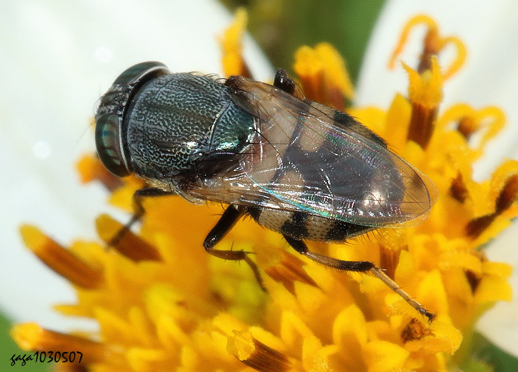 ↑不顯口鼻蠅 Stomorhina obsoleta / 1500-1600公尺 (麗蠅科 / 口鼻蠅屬) 體長約 7-8 mm,體型寬長,複眼大有多條黑色條紋,胸背板藍黑色密生細小斑點,有3條明顯的縱帶,雄蟲腹部黑褐色,第1-2節中央有1條黑色縱帶,各腳腿節黑褐色,脛節以下褐色。 腹部有多樣斑型,與黑色錐口蠅相較,本種胸背板較長,藍黑色具明顯的黑色縱帶,黑色錐口蠅胸背板較黑較短,一般不具藍色分布有銅色光澤,分布海拔較低。 本屬5種,本種主要紀錄於800-1500公尺山區,喜歡訪花,少見。 (附記 1 ) Stomorhina obsoleta,主要分布於北歐、西歐許多國家,少部份於中國的貴州和北京有紀錄,台灣百科有本種紀錄。 (附記 2 )