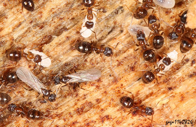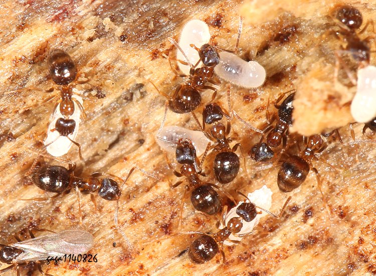 ↑尼蘭德山蟻屬 Nylanderia sp. (工蟻) (蟻科 / 山蟻亞科) 體長約2.5-3.5mm,體色紅褐色,頭部及腹部較黑,腹部具不明顯的橫帶,腹部肥大。 本屬2種,本種紀錄於2000公尺以上中高海拔山區,地棲或棲息枯木,可看到巢中的卵、幼蟲等。