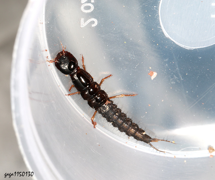 幼蟲體型狹長,黑色,頭胸部具光澤,體側有微小細毛,腹部端部窄,有2根尾毛。