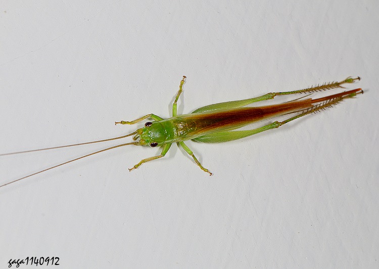 ↑ 台灣貝蟋 Beybienkoana formosana (樹蟋科 / 貝蟋屬 ) 物種描述: 雌蟲,體長約10.5mm,小型,體色綠色,體背紅褐色,身體修長,觸角細長,長可達身體的2.5倍,後腳發達,脛節密生毛刺。 近似種Beybienkoana trapeza,外觀與本種不容易分辨。 本屬10種,維基百科標示Beybienkoana formosana ,中名為台灣貝蟋,分類於樹蟋科,過去稱叢蟋科,俗名台灣長額蟋。 本種紀錄於低海拔約250公尺山區,夜晚會趨光。