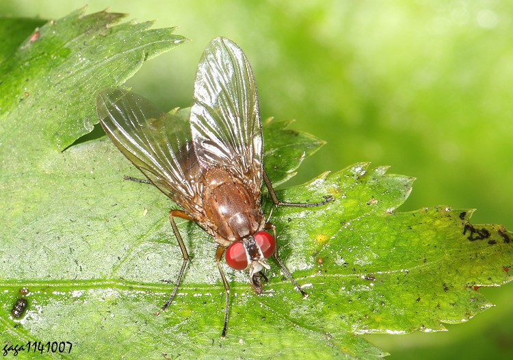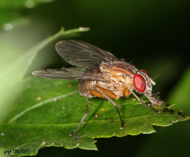 (蠅科 / 棘蠅屬) 體長7.5-8mm,體色黃褐色,複眼紅色,胸背板有2條黃色縱帶,腹部近端部漸呈灰褐色,翅膀透明,具一長一短的橫脈。