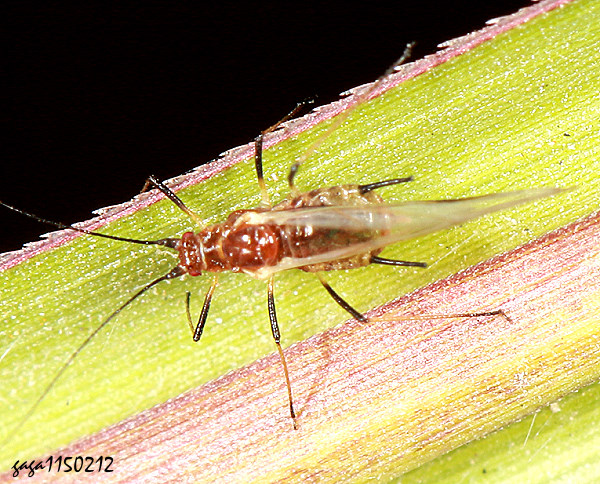 ↑芒蚜 Sitobion miscanthi (常蚜科) 成蟲體長2.5mm,含翅長4.3mm,頭部、胸背板褐色,腹部較淡,複眼紅色,翅脈簡單,翅膀半透明膜狀,前翅徑痣長橢圓形,淡黃褐色,中脈有分岔,各腳細長,腿節黑色,近基部淡黃色。 本屬6種,本屬又稱穀網蚜屬,本種寄主禾本科,紀錄於低海拔50-85公尺環境,少見。 (附記)