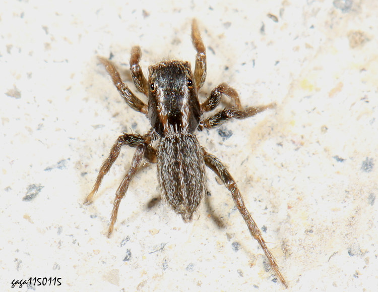 ↑擬伊蛛屬 Pseudicius sp.,雌,變異,頭胸背板有2條白色毛狀縱帶。