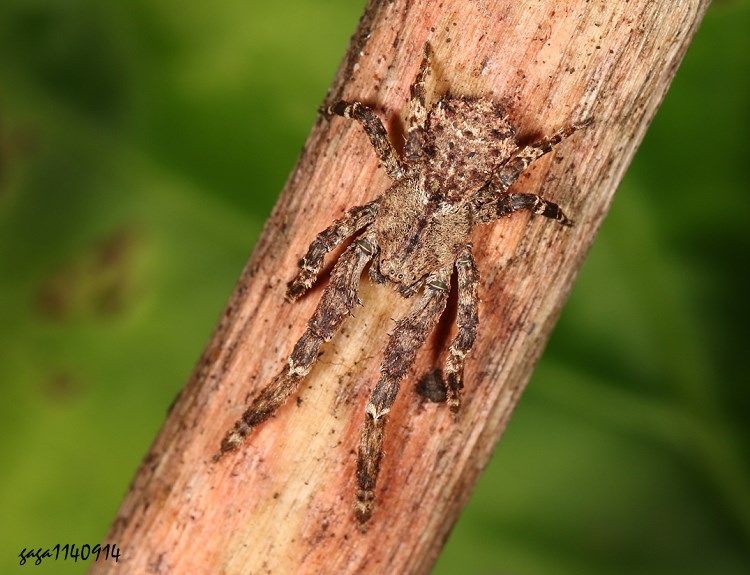 ↑雙瘤泥蟹蛛 (雌) (蟹蛛科 / 泥蟹蛛屬)體長 3.5-6.5mm,通體褐色,頭胸背板及腹部呈多邊型狀,腹背具瘤突,中央有一條不明顯的白色縱紋,近腹端密生毛刺,各腳粗短,第一步足最長,通常前伸。 本屬目前台灣生命大百科名錄沒有,本種舊稱海南泥蟹蛛 ,紀錄於低海拔500-800公尺山區,雌蛛產卵於葉背並有護卵的行為,曾見於地下的枯葉層爬行,牆角、枯枝等環境,保護色佳,不容易發現。