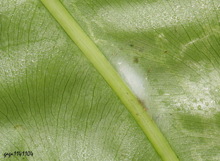 ↑臺灣蟻蛛,雌蛛的巢,築於葉片中肋邊。