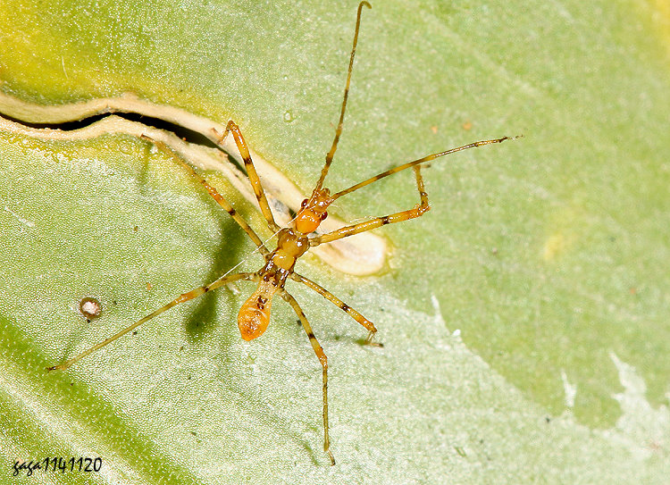 ↑多變嗯獵椿象,若蟲,胸背板淡黃褐色具黑色的絲狀縱線。