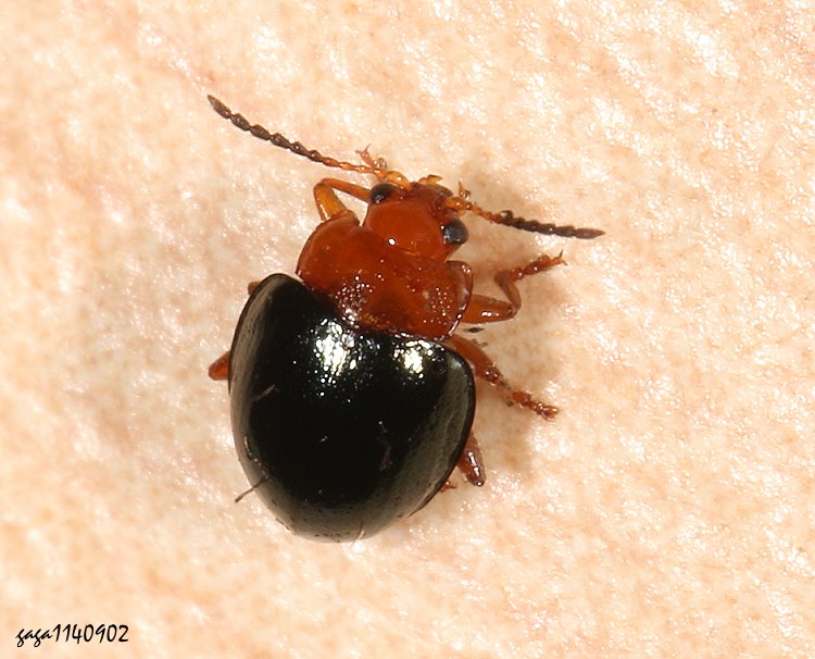 ↑四溝葉蚤,體長 3.6 mm,頭部、前胸背板紅褐色,前胸背板寬大,翅鞘黑色具光澤,後腳腿紅褐色膨大。