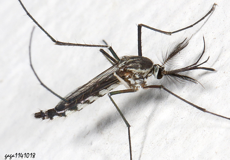 ↑白腹叢蚊(雄) (蚊科) 體長4-7.5mm,頭部白色,頭背具褐色的斑紋,胸背板褐色,側緣具白色的斑紋,一般白色三角型,翅膀具藍色的色澤,各腳褐色,脛節或跗節藍色具光澤,但個體差異很大。 本屬7種,本種普遍紀錄於平地至低海拔1000公尺山區 ,喜歡陰暗潮濕的樹林或草叢,通常於戶外,雌蚊會叮人,雄蚊觸角羽狀,不會吸血。 (附記) 叢蚊屬台灣已知7種,目前網路都將近似種都歸到白腹叢蚊Armigeres subalbatus,個人紀錄到許多照片胸背板及腹部斑紋特徵並不完全一致,有些個體脚的顏色變異很大。本欄站片暫置於同一種,未來應該會有更精確的分類報告出來。 本屬7種,為 Armigeres subalbatus 白腹叢蚊 其他:1141103、