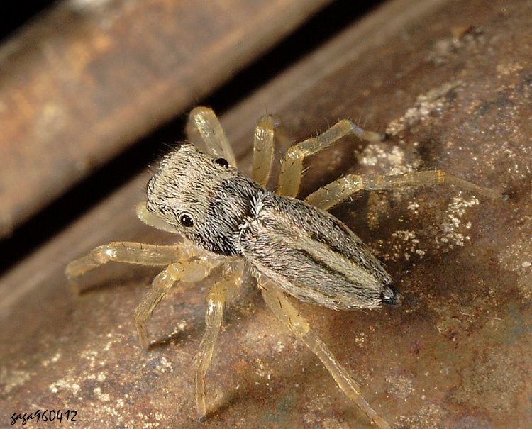 ↑柔弱黑條蠅虎,雌,後眼內側各有一條白色縱帶,觸肢黑色,末端尖長。(體長2.8mm)