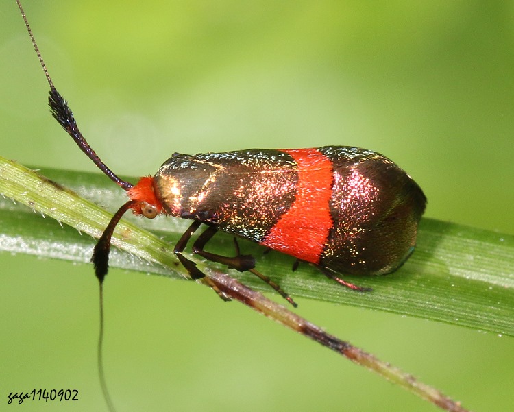 ↑紅帶長角蛾 (雌) (長角蛾科) 小型,觸角細長,前翅藍黑色,翅面中央有一條寬型的紅色橫帶貫穿,上下緣具淡藍色分布,各腳黑褐色。 外觀近似鑲黃帶長角蛾,但鑲黃帶長角蛾翅面的顏色具金黃的金屬光澤,本種翅面肌理較粗糙,布滿雜斑。 本屬20種之多,本種紀錄於中高海拔山區,稀少。