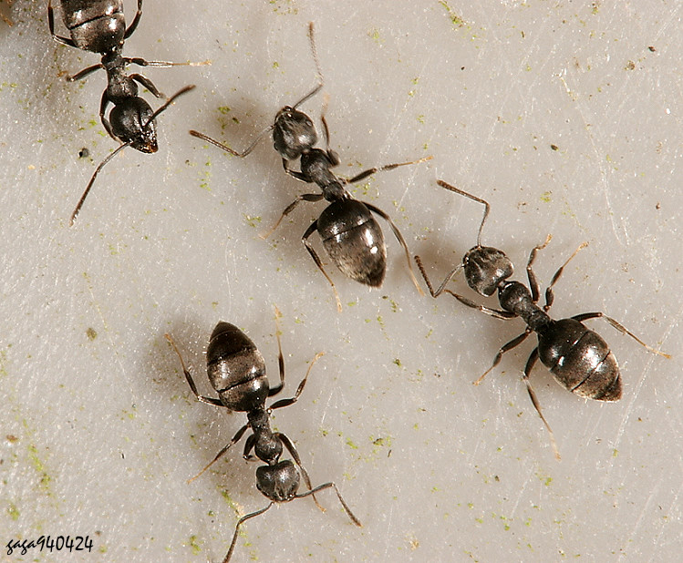 ↑褐足扁琉璃蟻,體長2.5mm,體色黑色,頭寬大於前胸,腹部較寬弧圓,腹背中央有2條不明顯的細窄橫帶,有些個體於兩帶間的顏色黑色,前後端灰白色,各腳及觸角黑色。 (鞍馬山)