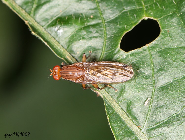 (沼蠅科) 體長7-8mm,頭寬橫向,複眼紅色,胸背板褐色,有4條淡黑色縱紋,中央的2條近鄰。