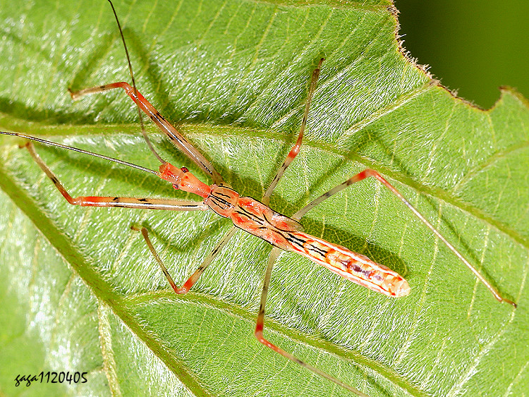 ↑黑角嗯獵椿象 / 200-300公尺 (獵椿科 / 嗯獵椿屬) 體長16.3-20mm,觸角細長黑色,體背及各腳橙色,頭部至前胸背板前葉有2-3條黑色縱紋,前葉黑色,後葉橙色,側角具刺棘,小盾片黑色。 本屬2種,本種紀錄於低海拔 150-300公尺山區,成蟲8月出現,10月可見卵,卵扇型長相像仙人掌,附著於葉背,卵的蓋柄白色,不指向同一個方向,部份個體會以成蟲型態越冬,廣泛分布。