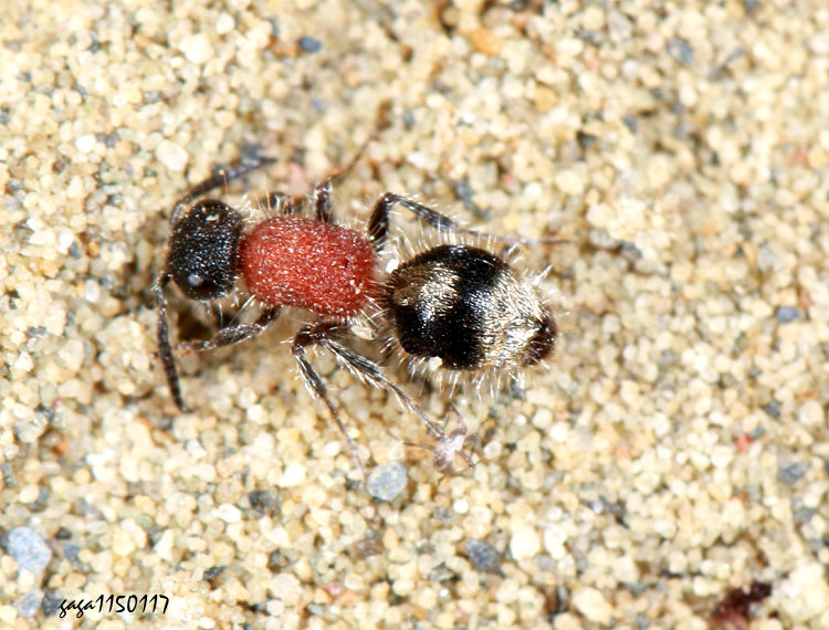 ↑寡蟻蜂屬 Trogaspidia sp. (雌) / 溪邊沙地 (蟻蜂科 /蟻蜂亞科 ) 體長9mm,雌,頭部及腹部黑色,胸部紅色,腹部近基部有一枚白斑,略長,腹端有白色的橫帶,全身及各腳布滿白色的絨毛。雄蟲體型粗壯,雌蟲長約雄的2/3,胸部黑色,腹部黑色,近基部有一節紅色,後有2條白色寬型的橫紋。 本屬4種,本種紀錄於海邊至低海拔的溪邊沙地,發現2隻,爬行很快躲進洞穴裡,本種與常見的蟻蜂不同,身上的絨毛特長。