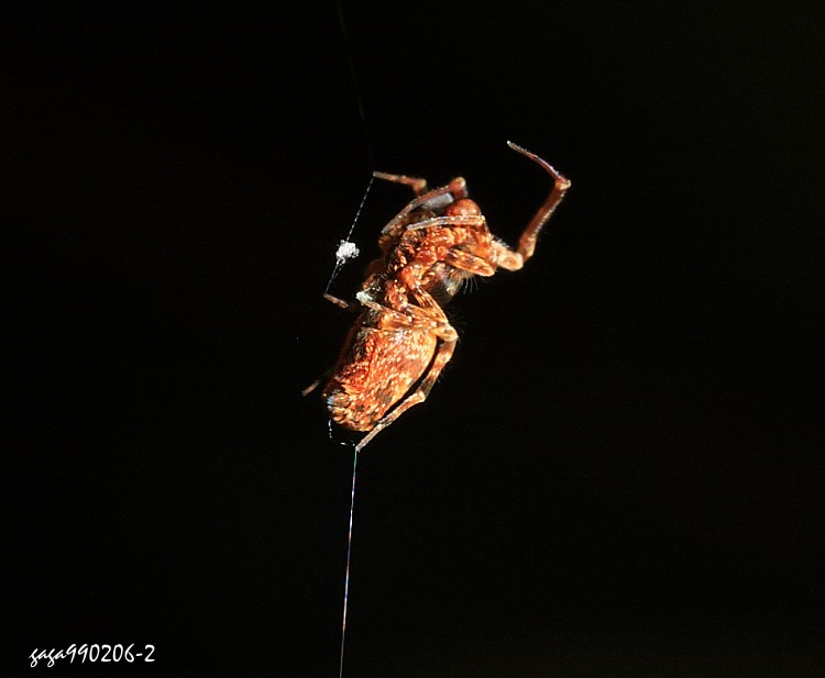 ↑蓬萊蟱蛛,若蛛,停棲時腹面朝上,水平掛在網上,前腳端部呈鉤針狀。(體長2.1mm)