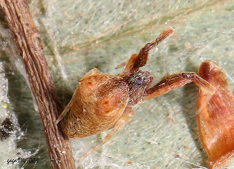 ↑蓬萊蟱蛛(雌),停棲時第1-2步足合併向前伸,第3-4步足貼腹側,模仿樹枝狀。(體長6mm)