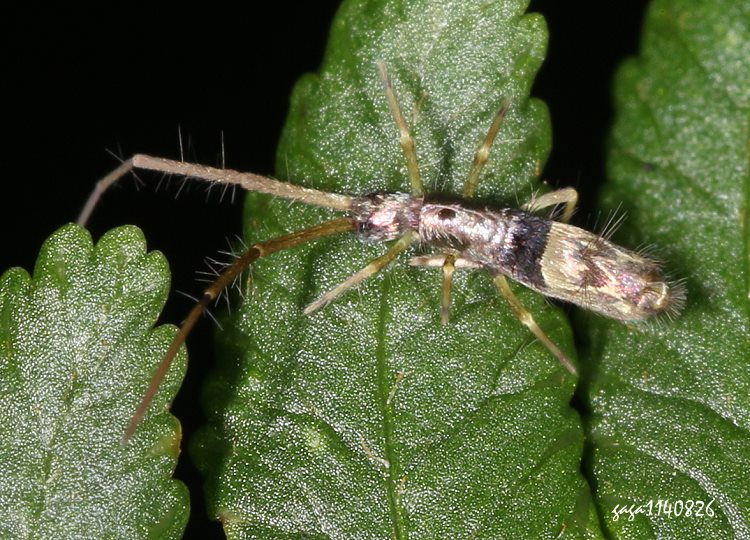 ↑長角跳蟲Callyntrura sp. (長角跳蟲科) 體長約3-4mm,體型瘦長,體背黑色具光澤,觸角長,各腳淡黃褐色。 本屬6種,本種紀錄於2000-2795公尺山區,下雨後爬到葉片,稀少。 (附記) 本種 iNaturalist 的同好鑑定是:爪跳蟲科 Paronellidae / 亞科 Salininae