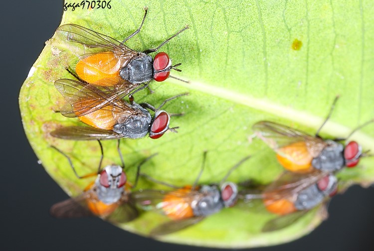 ↑寄蠅 Tachinidae (寄生蠅 / 長足寄蠅屬) 體長7.2mm(含翅長),複眼紅色,胸部背板灰黑色不具縱斑,腹部黃色鮮艷。 本種紀錄於500-1200公尺山區,發現成群的個體棲息葉背,非常特殊。外觀近似家蠅科的黃腹家蠅 Musca ventrosa,但翅脈特徵不一樣。