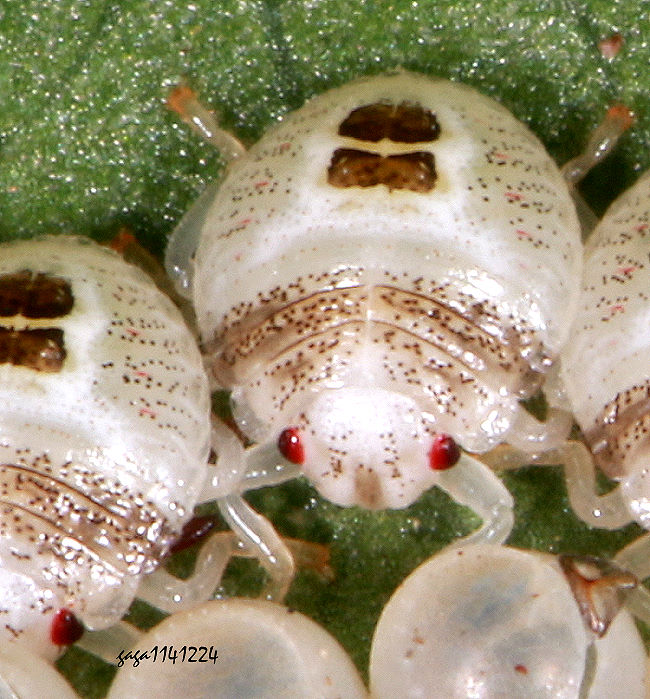 (椿科) 若蟲,體色白色,複眼紅色,胸背板具褐色的刻點及橫紋,腹部中央有2枚寬型的橫斑。