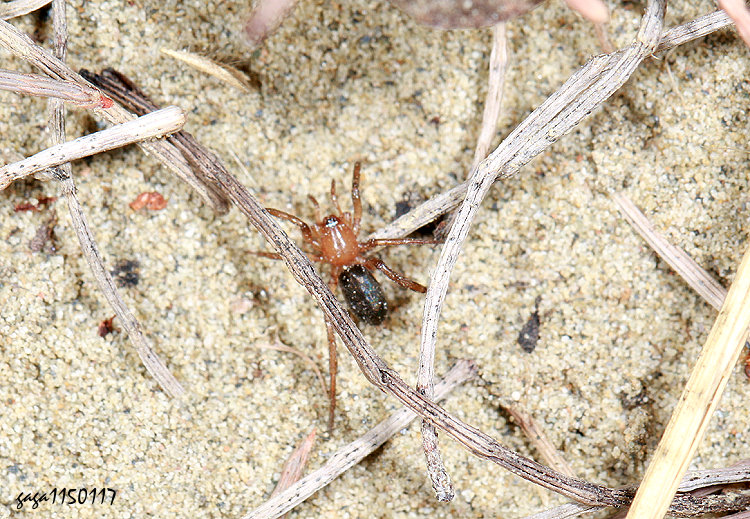 ↑狂蛛屬 Zelotes sp. (鷲蛛科) 型態描述: 體長約3-5mm,頭胸部橙黃色,覆布藍綠色具光澤,各腳粗、長,橙黃色。 型態近似Zelotes reduncus,該種分布於南非,稀少。 本屬11種,本種紀錄於海邊環境,棲息草叢或枯木下,稀少。 (附記) Zelotes reduncus俗稱普通暗地蛛,分佈於非洲南部。