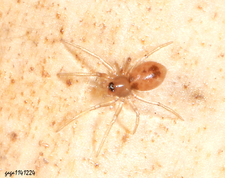 (皿蛛科) 體長1.6mm,體色淡褐色,腹部卵型,近基部有2枚黑斑,近端部有4枚黑斑,上斑較小,各腳長,透明。