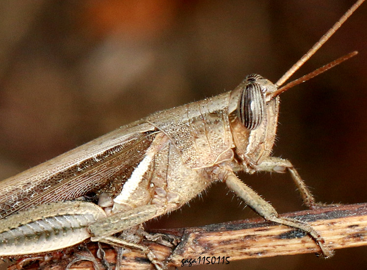 (蝗科/直斑腿蝗屬) 中大型,體型狹長,體色灰褐色,觸角直,短,頭扁,複眼外突,下緣有一條黑色短斑,胸背板側緣在眼後方具黑色粗寬的縱帶,前翅近基部有一條醒目的白色斜紋,側背上緣黑褐色,翅端超過腹部,末端窄,後腳腿節粗壯。 本屬3種,外觀都很像,分辨不容易。