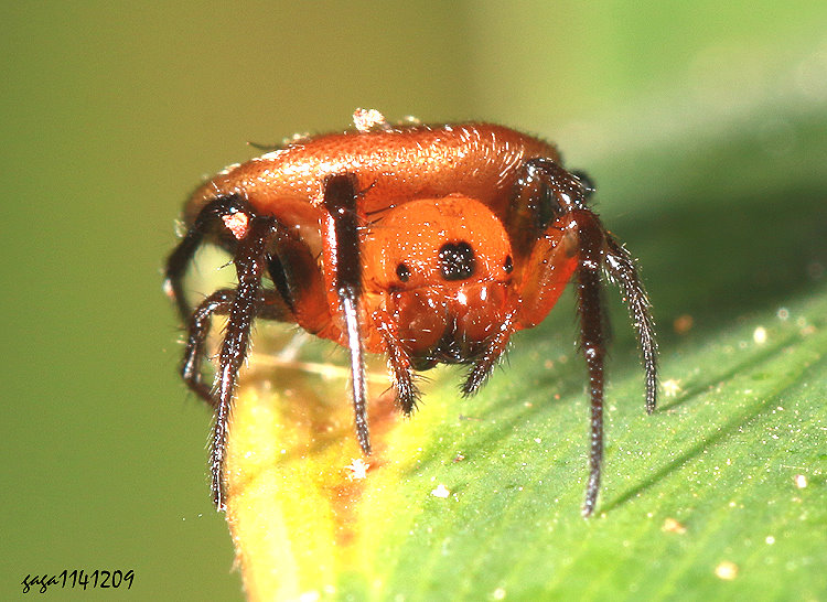 ↑蛇紋蛛 (雌) (攝影:嘎嘎990120) / 500-560公尺 (金蛛科 / 紋蛛屬) 體長約3-3.5mm,頭部小,體背圓盤狀,極扁,黃褐色,背方近側緣有不明顯的顆點排列及橙紅色斑,各步足除基節黃褐色外都是黑色,腹面黃褐色至橙黃色,側緣及端部有黑色斑。 雄蛛型態與雌蛛不同,體色橙黃色,腹部寬長。 本屬1種,舊稱扁秃頭蛛、羅氏阿園蛛,本種紀錄於低海拔500-560公尺山區,築圓型網,棲息草叢或陰暗的樹林,網很大,曾見橫跨一公尺寬的樹幹間築網,隱密性高不容易發現。 (附記) 蛇紋蛛 Anepsion roeweri ,主要分布於台灣、菲律賓及巴布亞紐幾內亞等地,在台灣南、北廣泛分布,但不容易找到牠。 其他:1141209(5428)、