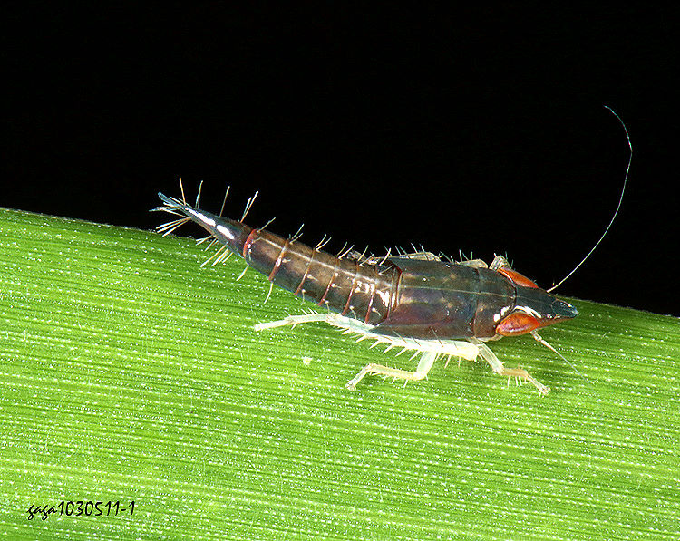 ↑ 帶葉蟬屬 Scaphoideus sp. ? (若蟲),體型瘦長,體背黑色具光澤,頭部前端口吻尖長,複眼褐色,各腳脛節端部以下黃白色,脛節內側具排刺,分布於1000公尺左右山區,不普遍。(體長2.9mm)