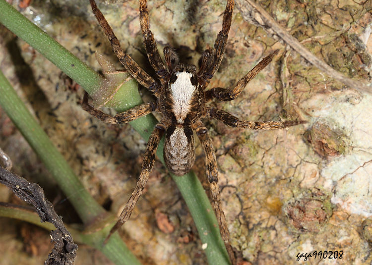 ↑石垣櫛蛛,頭胸背板上方有一塊明亮的縱斑,上寬下窄,邊緣呈鋸齒紋。