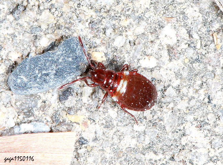 ↑背孔長椿亞科 Nithecus sp. / 20-80公尺 (長椿科 ) 體長4.5-5mm,體型長橢圓型,短翅,腹部寬扁,具橫向的條紋,中央有一條不明顯的縱紋,後方有2-3枚黑斑。 若蟲型態近似Nithecus jacobaeae,該種廣泛分布於歐洲,亞洲少有紀錄,一般短翅,也有長翅型。 本屬目前名錄沒有,紀錄於海邊至平地,地棲性,善於爬行,具刺吸式口器,觀察棲息環境,可能以某種草叢類植物的或吸食植物汁液為食,群聚性,稀少。 (附記) 本種型態也很像Elasmolomus屬的若蟲,需要再鑑定。