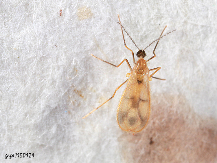↑癭蚋 (癭蚋科)體長2.8mm,體背黃色,頭部黃白色,複眼大,黑色,觸角各鞭節呈橢圓球狀,各節長短近似,翅膀紙質淡黃色,翅面有2條灰黑色的橫斑,各腳細長,黑褐色但前中腳脛節及後腳黃白色。 本種分布於中海拔山區,夜晚會趨光,有些個體棲息牆角,姿態很特別,前中腳向前伸出,後腳向後垂直,模樣像大蚊。
