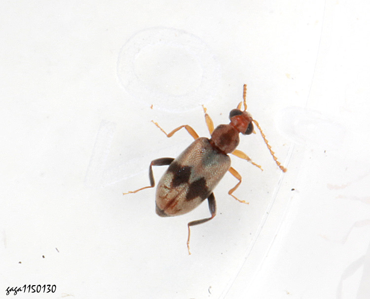 (蟻形蟲科) 體長2-3mm,頭部橢圓形,褐色,觸角黃褐色,前胸背板稍寬,翅鞘銀白色,近基部有暗色分布,中段有一條黑色粗獷的橫帶,近內側縱向,各腳黃褐色,後腳黑色。