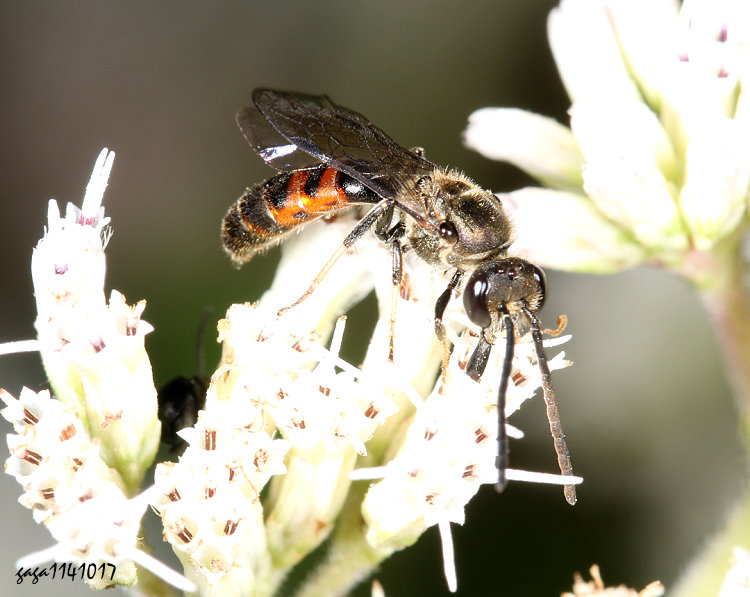 (隧蜂科/隧蜂屬) 體長約5-6mm,體色略長,黑色,胸背板密生絨毛,腹部橙褐色,背面具黑色橫斑,近端部黑色分布發達。 本圖可能是雄蟲,一般體型較大,觸角較長,雌性較短,腹部雄蟲顏色也較鮮艷。