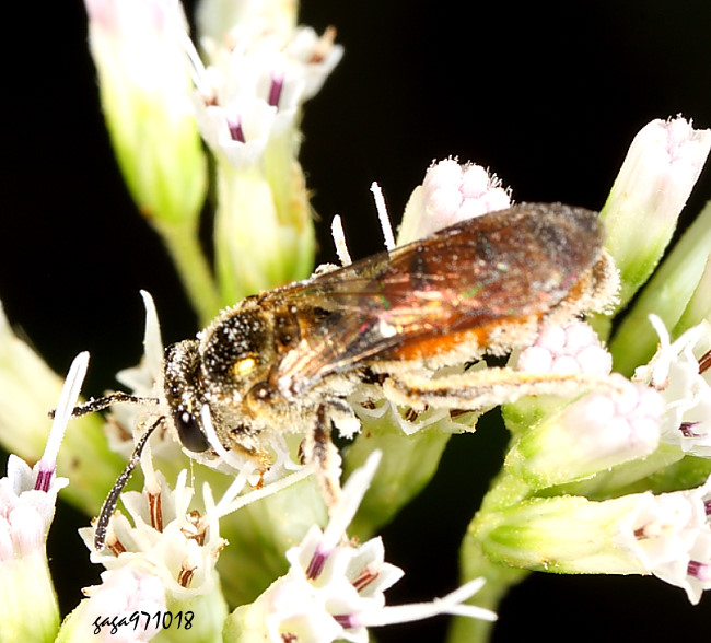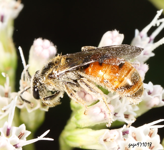 ↑淡脈隧蜂屬 Lasioglossum sp. (隧蜂科/隧蜂屬) 體長5-5.5mm,頭及前胸背板黑色具銅色金屬光澤,中後胸背板黃褐色,腹背條紋黑、黃相間,黃色環紋寬大,各腳黃褐色,全身具細毛。 本屬14種,本種體型很小,紀錄於900-1000公尺山區,秋末季節成群於台灣澤藍花朵上吸蜜,訪花時習慣將身體捲曲包覆整個花冠,致使全身及各腳黏著花粉。