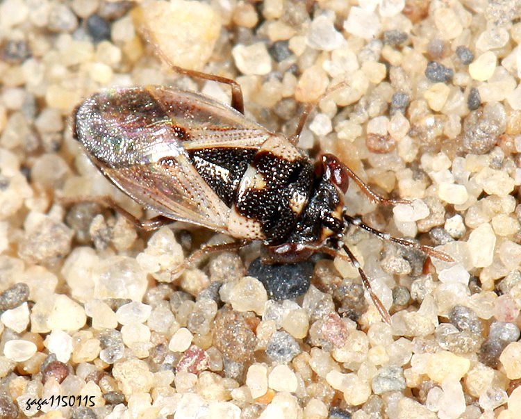 ↑大眼長椿象 / 20-30公尺 (長椿科)體長2.5-3.5mm,小型,體型寬廣,頭部黑色,觸角4節,黑色,端部褐色,前胸背板黑色具刻點,中央及左右淡褐色,中間的淡褐色縱紋上窄下寬,上端呈倒三角形,小楯板黑色,前翅革質翅淡褐色,近內側端部有1枚黑色斑點,膜質翅透明。 本屬4種,本種紀錄於低海拔20-100公尺環境,常見棲息地面或雜草叢,不擅飛行,中南部較多見。 其他:1150117(8401)、