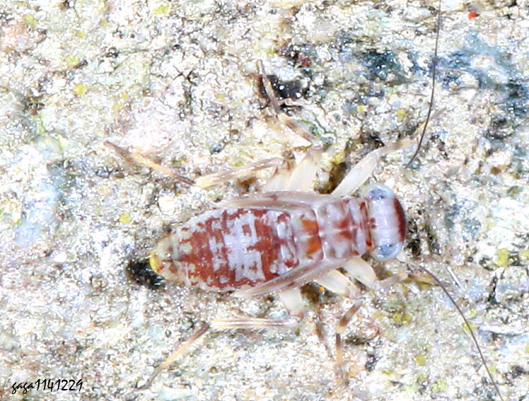 ↑擬蛾嚙蟲屬 Paramphientomum sp.,棲息河床的岩石,遇到騷擾仍在石上亂竄不會遠離石塊。(體長4mm)
