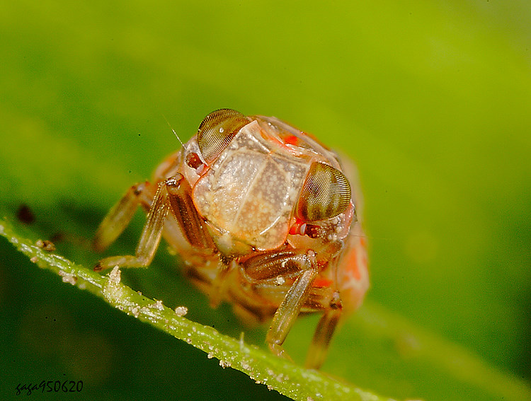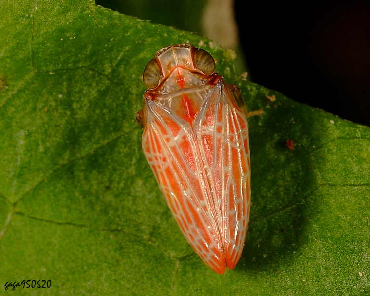 ↑三脊圓飛蝨屬 Chlamydopteryx sp. / 1000-1200公尺 (南部) (圓飛蝨科) 體長7.8mm,體色較鮮艷,橙色,頭胸部中央有一條縱線,翅縱脈白色,有多條短小的橫脈,翅端漸窄而尖。與近似種相較,本種翅面不具複雜的斑紋,斑型多呈格子狀。 本種紀錄於中海拔1000-1200公尺區,稀少。 (附記) Chlamydopteryx(中譯:披翅圓飛蝨屬 或