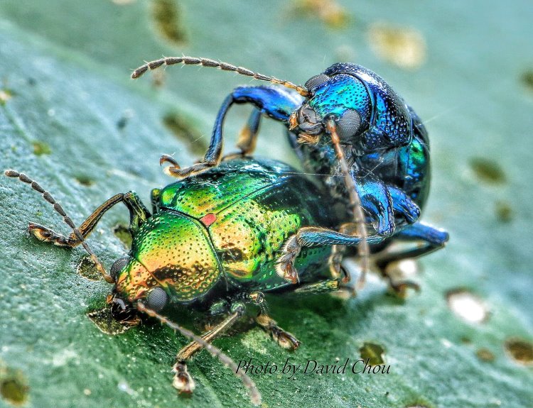 ↑彩豔溝腳猿金花蟲 (綠色、藍色型個體交尾) (攝影:周年富(David Chou) )