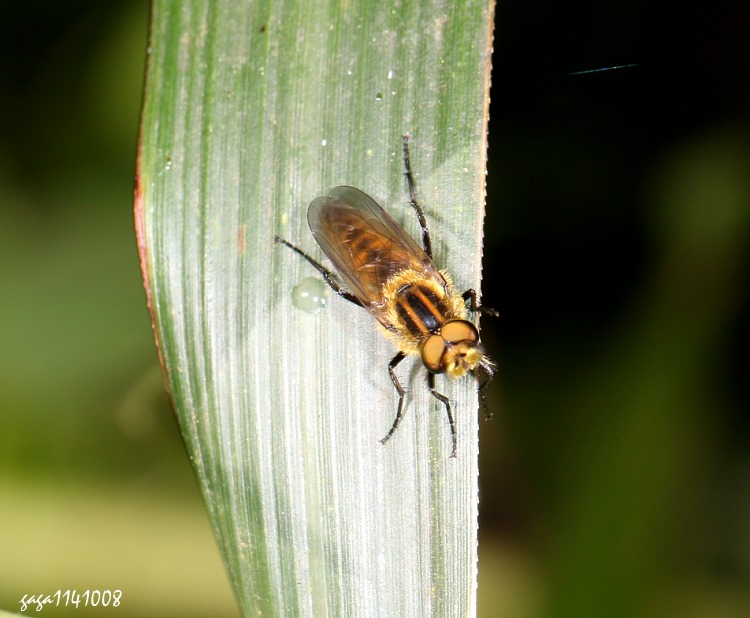 (劍虻科) 中小型,體色淡褐色,胸背板有3條黑色的縱帶,眼後緣及胸側緣密生金黃色短毛,翅膀透明,各腳黑色,腹部有黑色的橫向短斑。