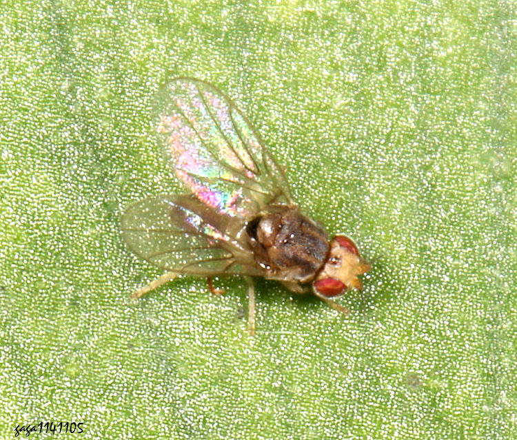 (稈蠅科) 體長3mm,體背淡褐色,中胸背板有3條黑色縱帶,腹部窄,淡褐色,翅膀寬透明。