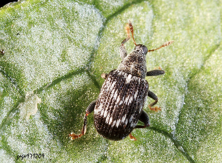 ↑象鼻蟲 Orchestes sp. (象鼻蟲科 / Curculioninae亞科) 體長只有2-2.3mm,體背具絨毛及灰白色的橫向斑紋,2列,弧形,小楯板白色,近翅端黑色。 外觀近似Orchestes rusci,該種廣泛分布於歐洲,亞洲地區沒有紀錄。 本種分布於低海拔700-800公尺山區,少見。 本屬2種,為