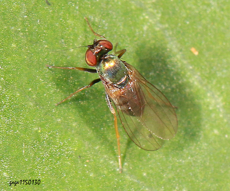 (長足虻科) 體長 2-3 mm,體型甚小,胸背板藍綠色具金屬光澤,有3條不明顯的縱紋,腹部淡褐色,具細窄的環紋,各腳淡褐色,腿節黑褐色。