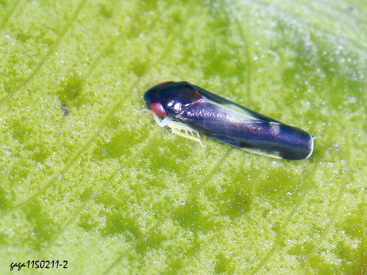↑窗翅葉蟬屬 Mileewa sp. / 1300-1400公尺 (葉蟬科 / 窗翅葉蟬亞科Mileewinae) 體長3.2-3.5mm,體色藍紫色具光澤,前胸背板寬廣,小盾板無斑,前翅近後緣有一枚模糊狀的白斑,下方還有一枚白色小斑,前緣有一條細窄的白色長斑。 本屬9種,本種紀錄於中海拔 1300-1400公尺山區,棲息葉背,稀少。