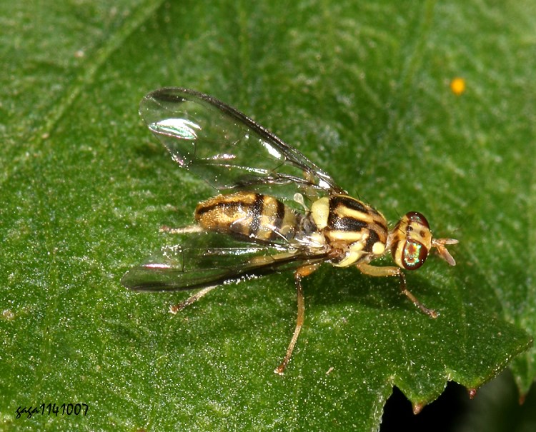 ↑如寡毛實蠅屬 Zeugodacus sp. (果實蠅科 / 如寡毛實蠅屬) 體長 4.5 mm,斑型近似南瓜實蠅,但本種體型較小,胸背板的3條黃色縱帶較粗,腹部非常窄。上圖是雄蟲,但南瓜實蠅的雄蟲腹部沒那麼瘦窄,型態跟雌蟲差不多。 本屬13種,本種紀錄於1300公尺山區,稀少。
