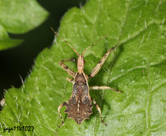 ↑塔獵椿象,體色暗紅褐色,胸背板前葉下側角不具短刺。