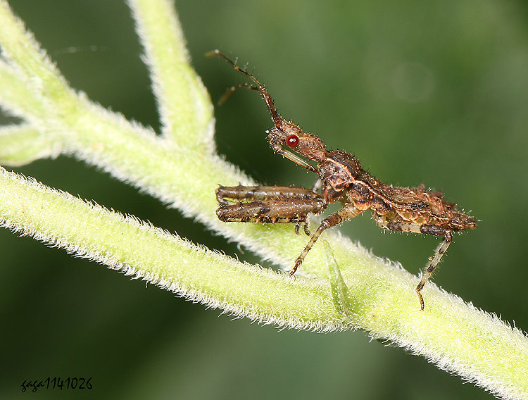 ↑塔獵椿象 (獵椿象科) 體長 12 - 14 mm,體深褐色,體表佈滿黃褐色絨毛,頭部側緣至前胸背板側緣有黃褐色邊線,後緣隆起具瘤狀突起,側角無銳刺,腹部向外擴張,側接緣的斑白色。 本屬2種,本種紀錄於低中海拔 500-1700公尺山區,成蟲2-5月,若蟲於10月大量發生於1500-1700公尺山區,但一般少見。