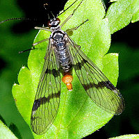 ,膜質,有些種類翅膀退化,前後翅脈相同,腹部十節具尾毛,腹末上舉,雄蟲尾端生殖器膨大猶如蠍尾螫鉤,故稱為舉尾蟲或蝎蛉。全世界已知有300多種,台灣已知為50多種。 |