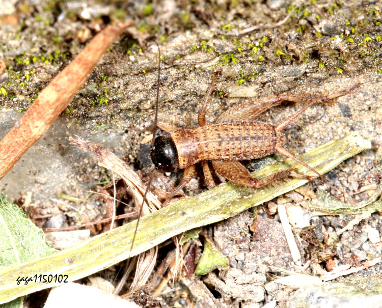 ↑黃斑蟋蟀,若蟲,眼後方具黑色縱帶。